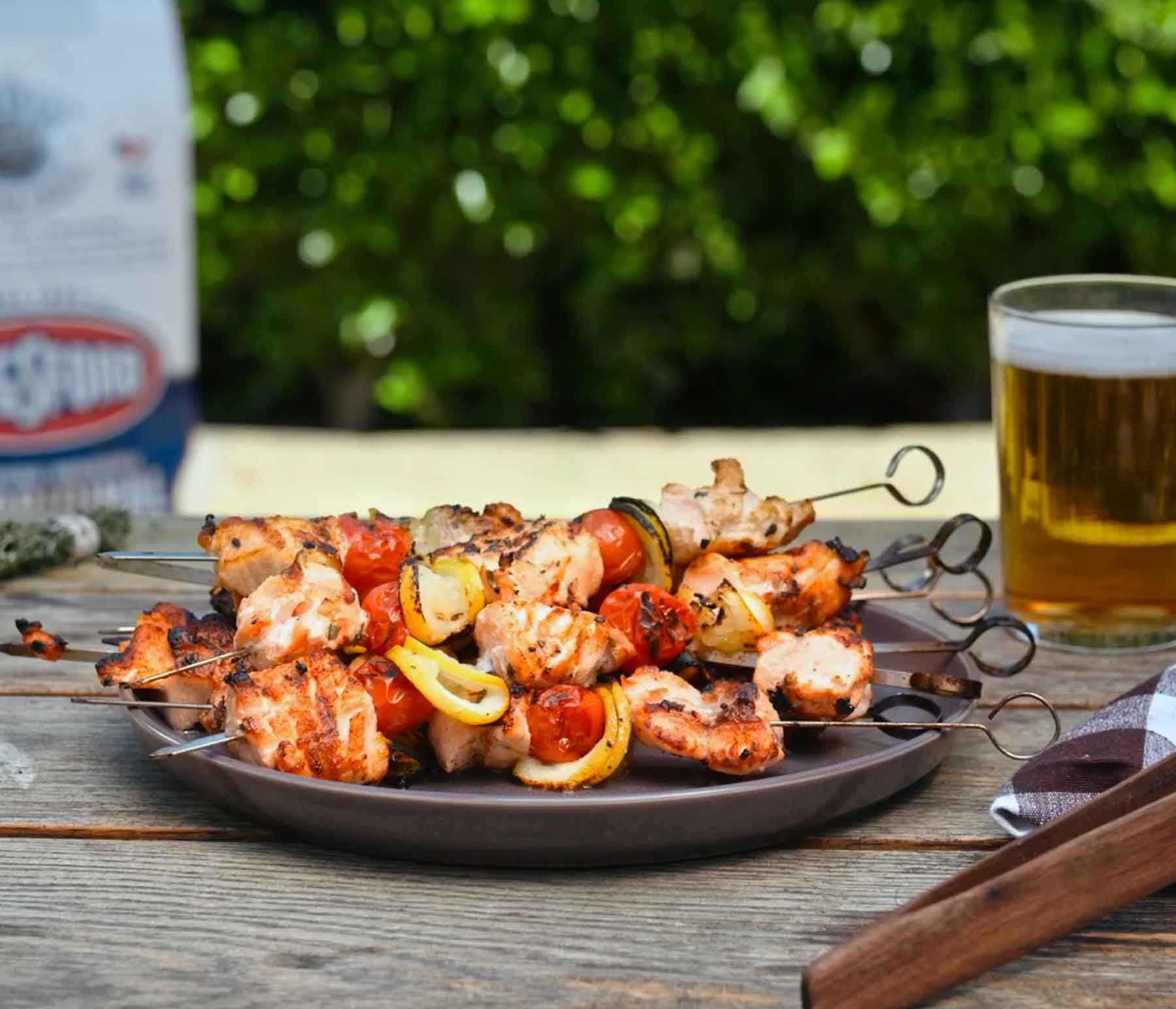 Bamboo skewers are inexpensive and readily available. But because they’re made of thin pieces of bamboo, they’re flammable and can catch fire during grilling. To prevent this, soak your skewers in warm water for at least 1 hour prior to assembling your kabobs. When using skewers with wooden handles, it’s advisable to hang the wooden handles over the edge of the grill or make a heat barrier with a doubled piece of aluminum foil.