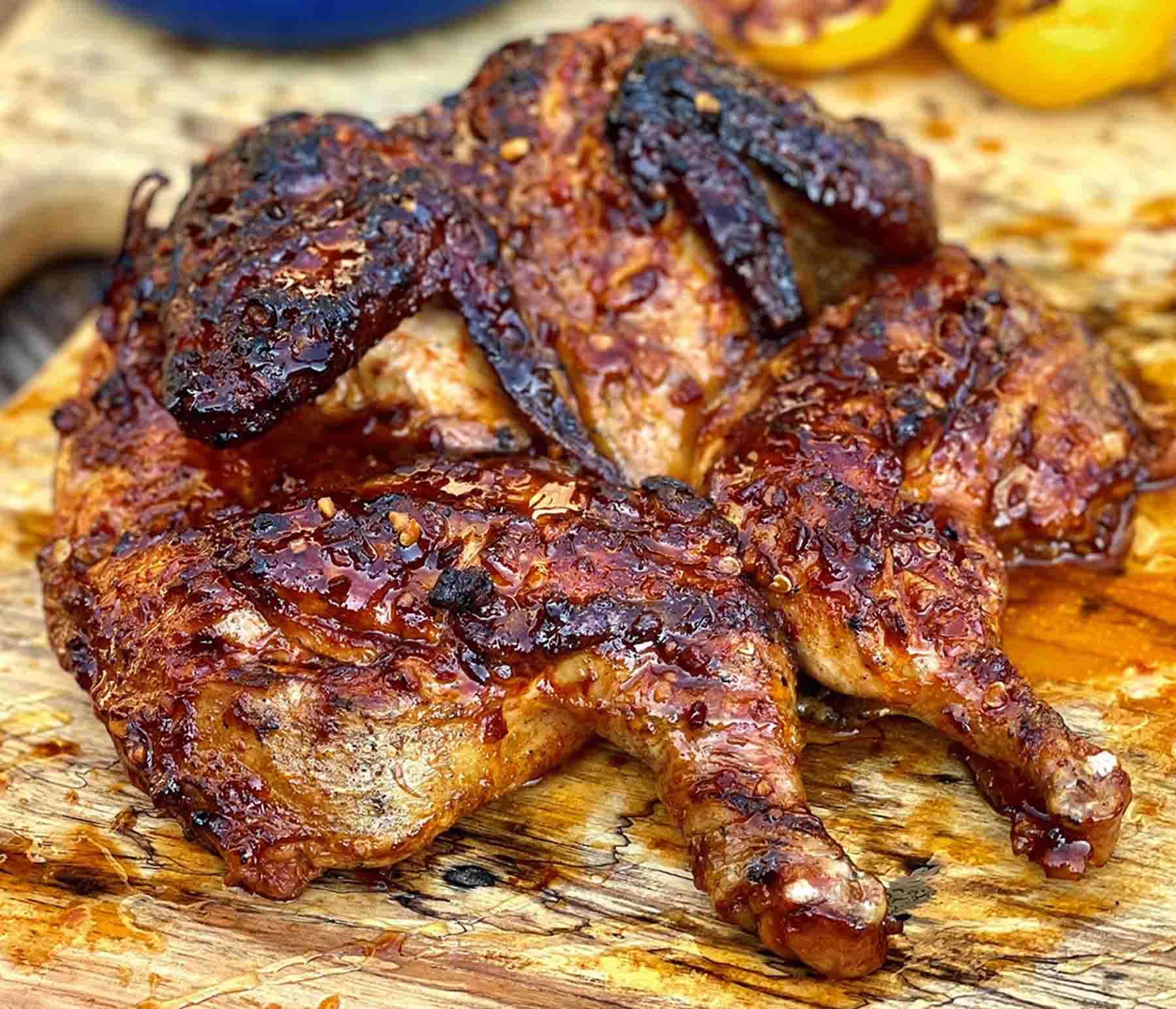 - Remove your chicken from the grill, basting it with the pan drippings and drizzling it with honey before serving.