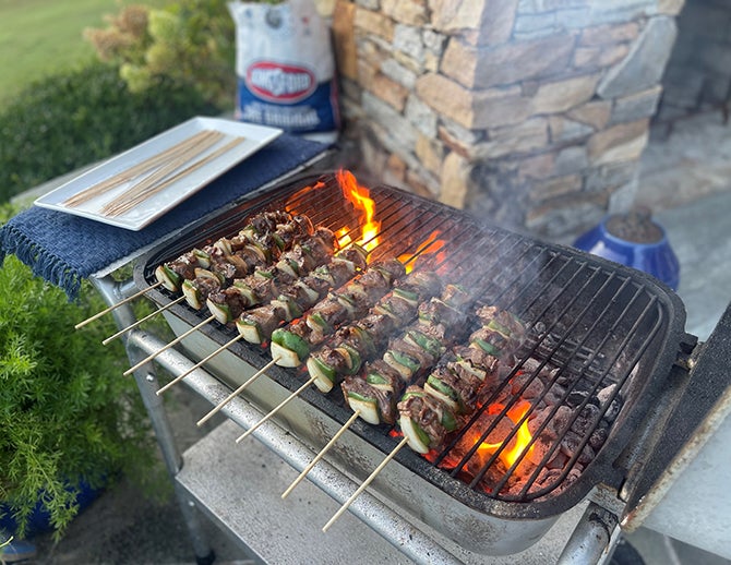 Bamboo skewers are inexpensive and readily available. But because they’re made of thin pieces of bamboo, they’re flammable and can catch fire during grilling. To prevent this, soak your skewers in warm water for at least 1 hour prior to assembling your kabobs. When using skewers with wooden handles, it’s advisable to hang the wooden handles over the edge of the grill or make a heat barrier with a doubled piece of aluminum foil.
