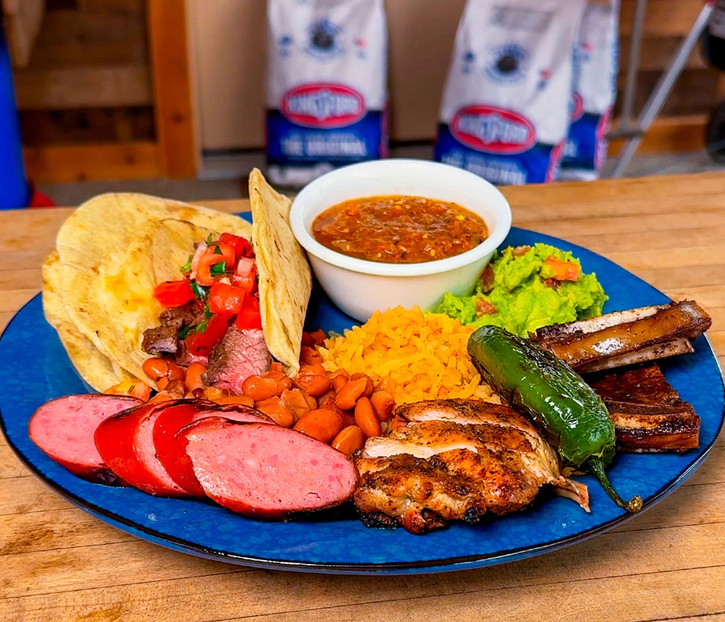 Bring authentic Mexican cuisine to your backyard — this savory assortment of grilled meats, served with Spanish rice and charro beans, is the ultimate Mexican barbecue.