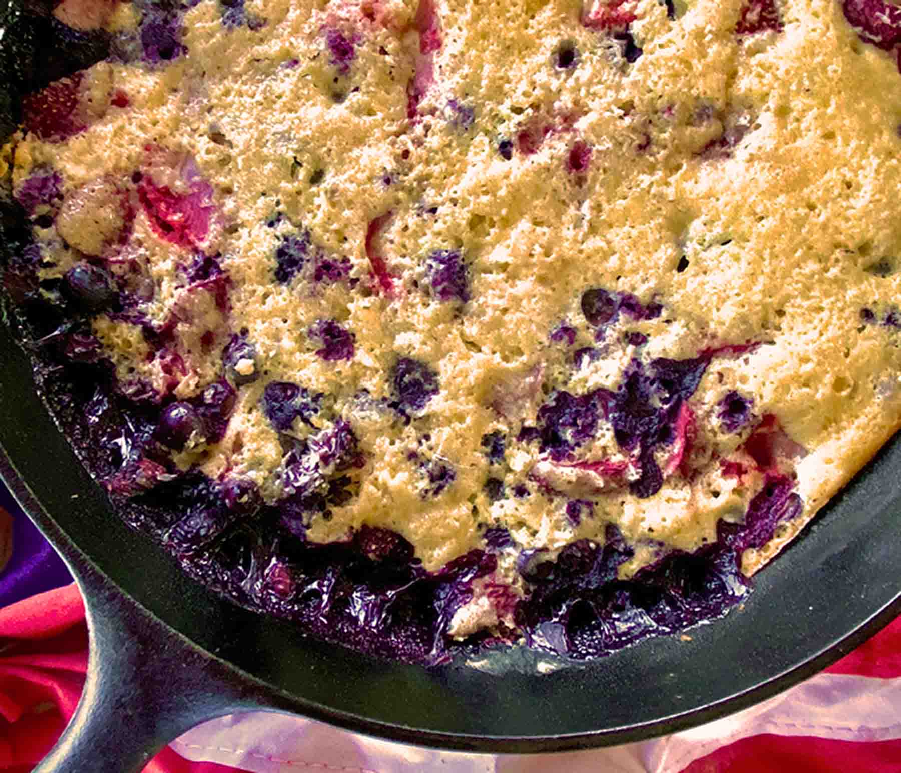 Place the cast iron skillet directly over the coals for 25 minutes or until the fruit is bubbling up and the cake has turned golden brown.