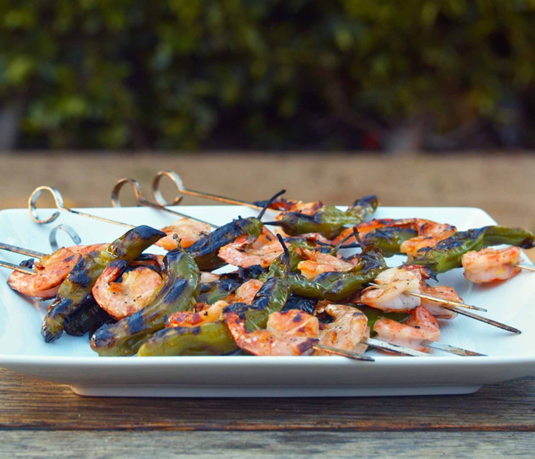 Place the shrimp skewers on the grill, and cook until the peppers are slightly charred and the shrimp is cooked through, about 2–3 minutes on each side. Don’t overcook your shrimp, they cook quickly. Fully cooked shrimp turn pinkish on the outside and white on the inside.