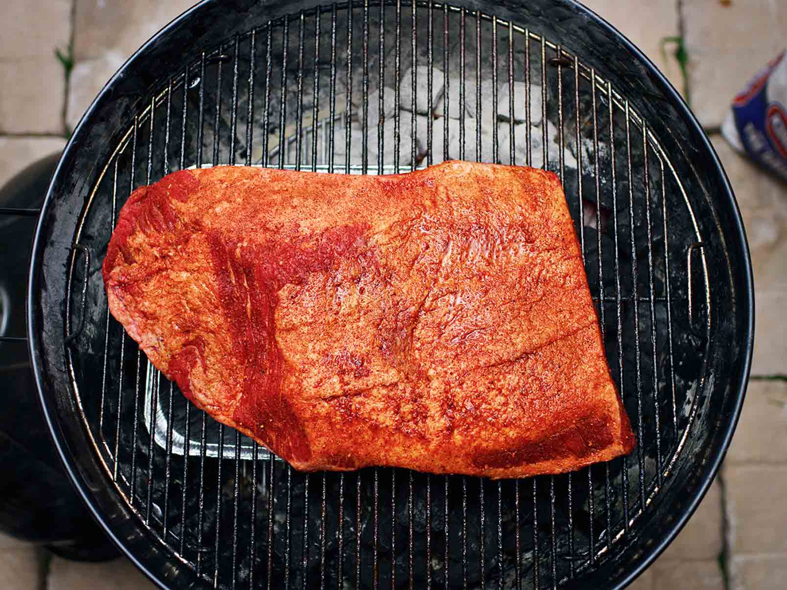- Refrigerate for several hours to let the dry rub penetrate the meat, or simply put the brisket on the grill after applying the dry rub.