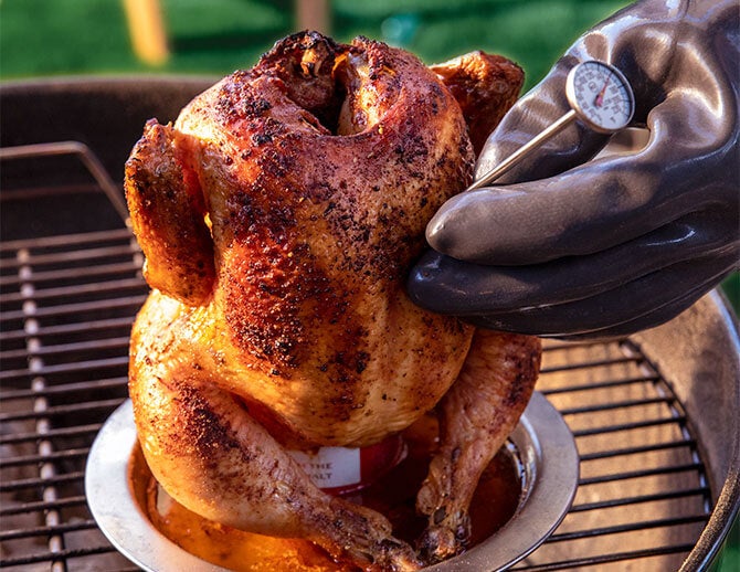 After 60 minutes, remove the lid every 10–15 minutes to check for doneness using an instant-read meat thermometer. Insert the tip into the thickest part of the thigh without touching the bone. When the internal temperature reaches 165°F, remove your chicken from the grill using tongs. An average 4 lb. chicken will take about 90 minutes to grill-roast.