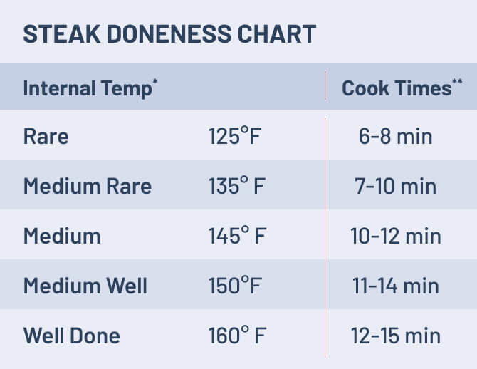 ** Cooking times are approximate and based on a 1” steak, including sear time.