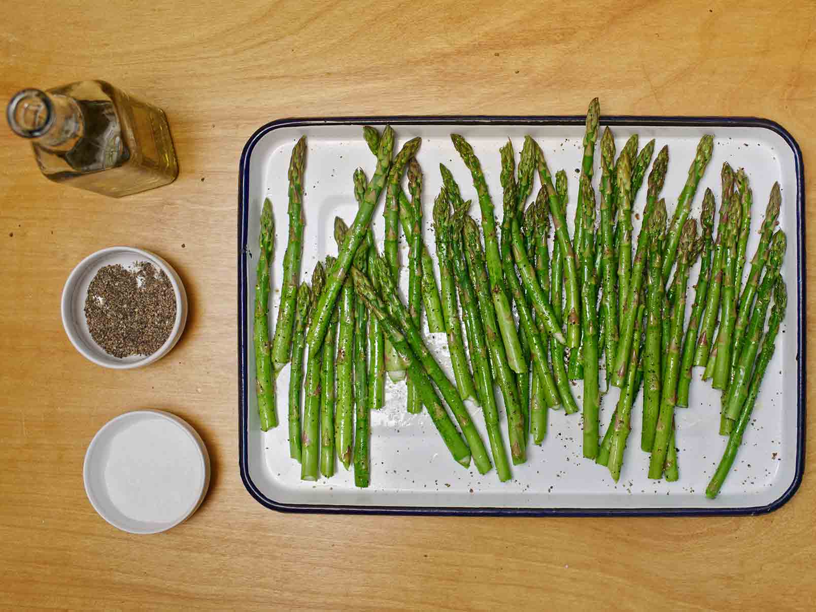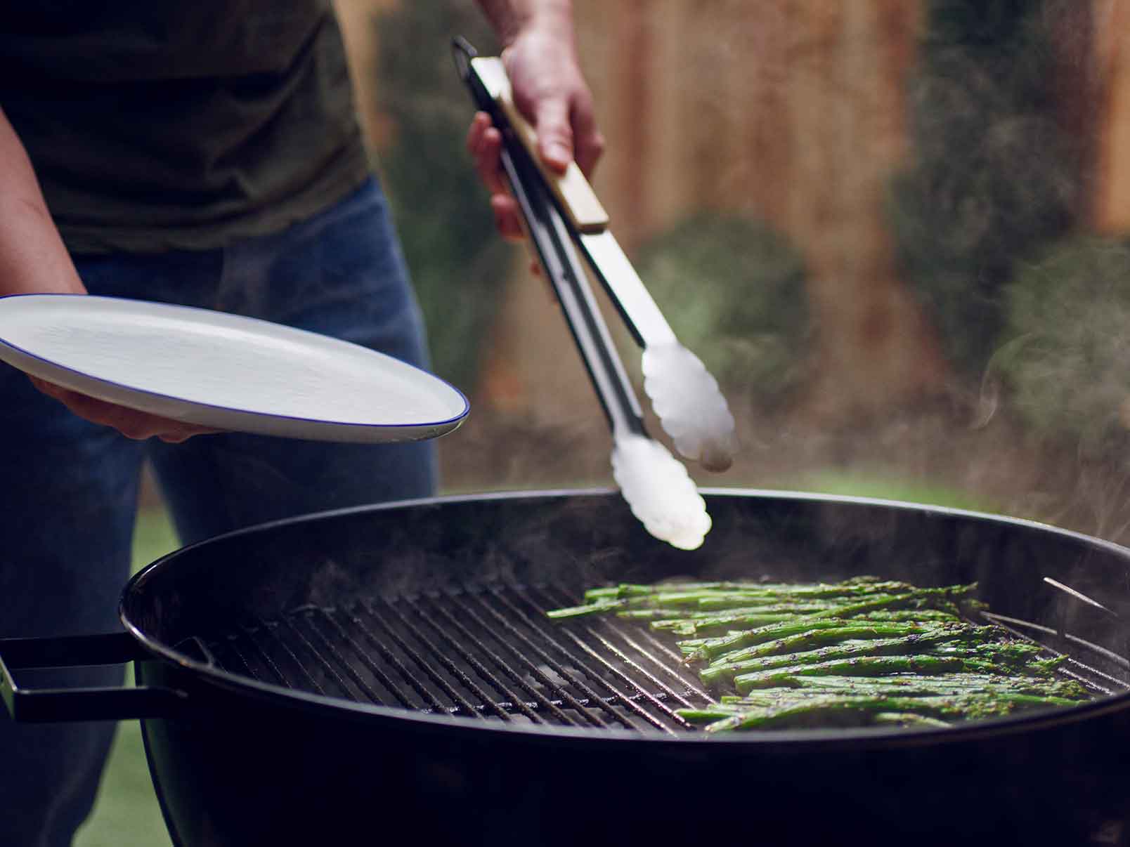 - Place the asparagus stalks on the grate (perpendicular to the grate), directly over the coals.