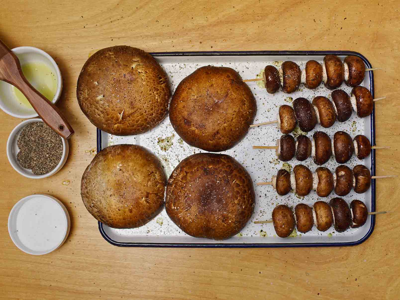 - Lightly coat the small and large mushrooms with vegetable oil or olive oil.