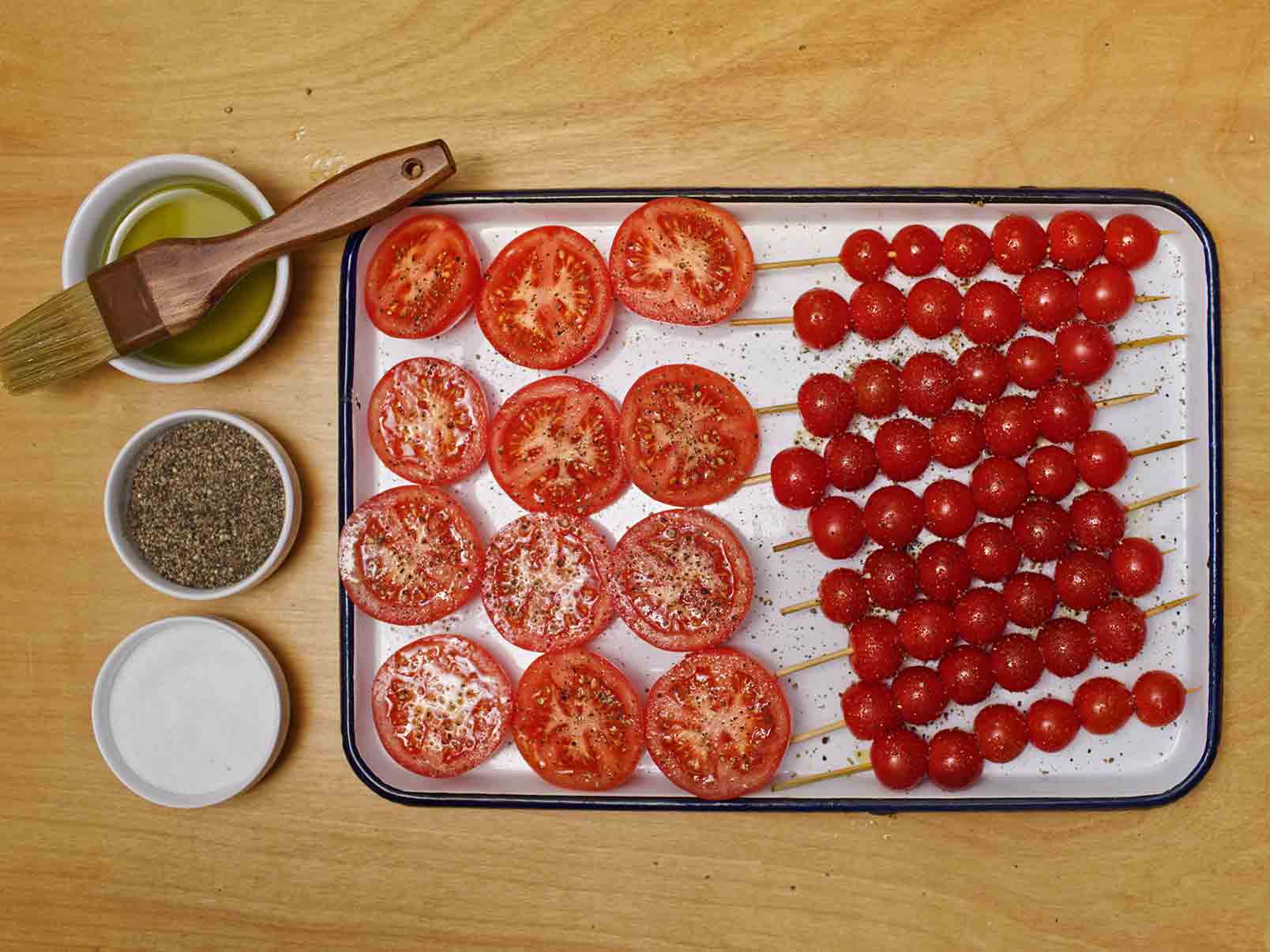 - Place small tomatoes on a skewer (like cherry tomatoes). If using wooden skewers, soak them in warm water for at least 1 hour before grilling.