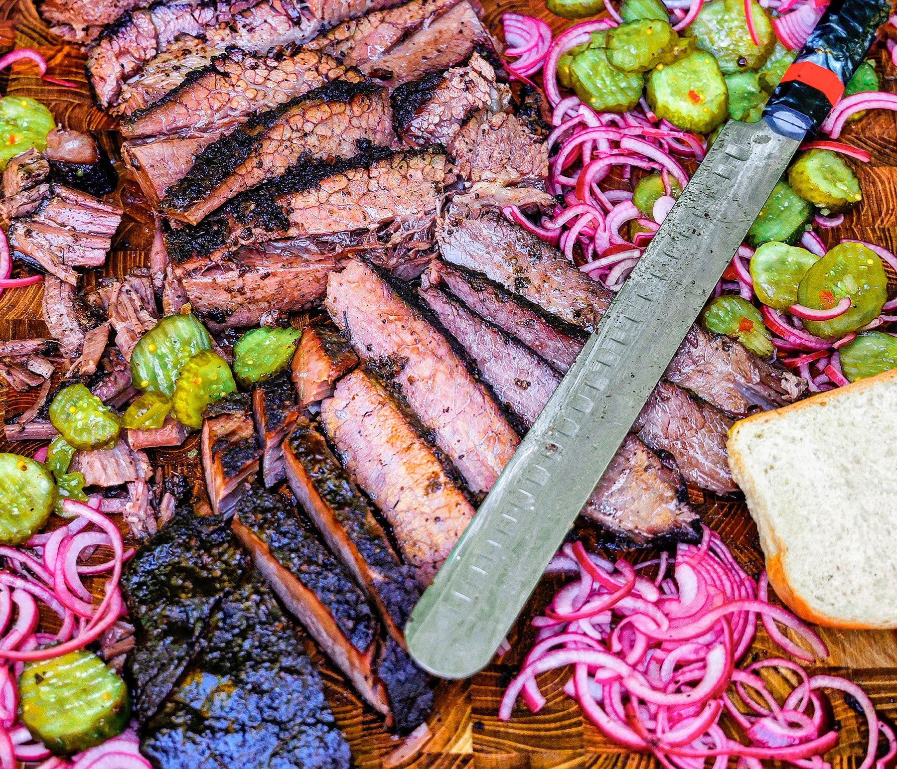 - Remove the brisket from the butcher paper, and slice across the grain of the meat.
