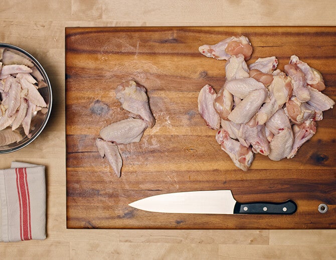 First, mix together your sauce ingredients in a small mixing bowl until well combined. Next, separate the chicken wings into wings and drumettes.