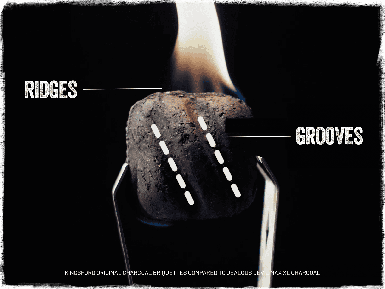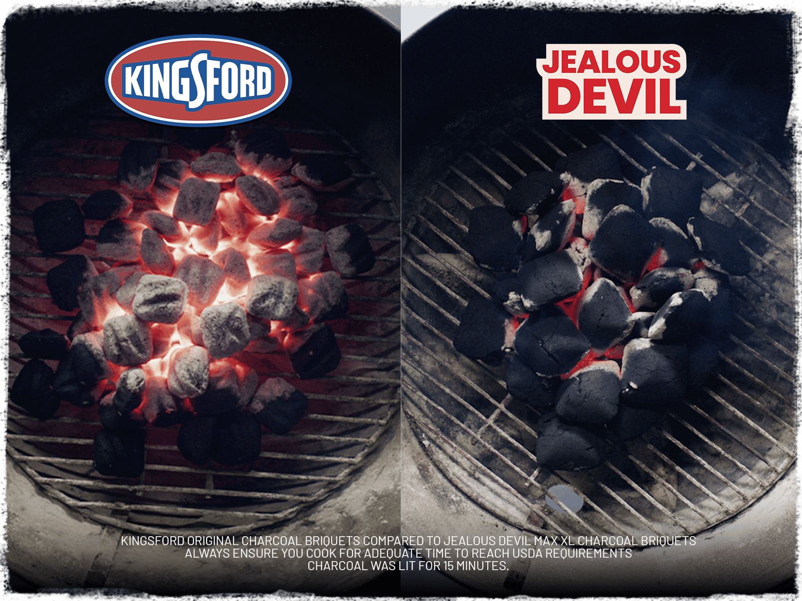 With our signature ridges and grooves built into every briquet, Kingsford charcoal is fully ashed and ready in just 15 minutes—giving you faster heat and quicker cook times. That means you can fire up the grill and get cooking without all the waiting around. In our lighting test, Jealous Devil briquets took longer to ignite and didn’t deliver the same consistent heat.